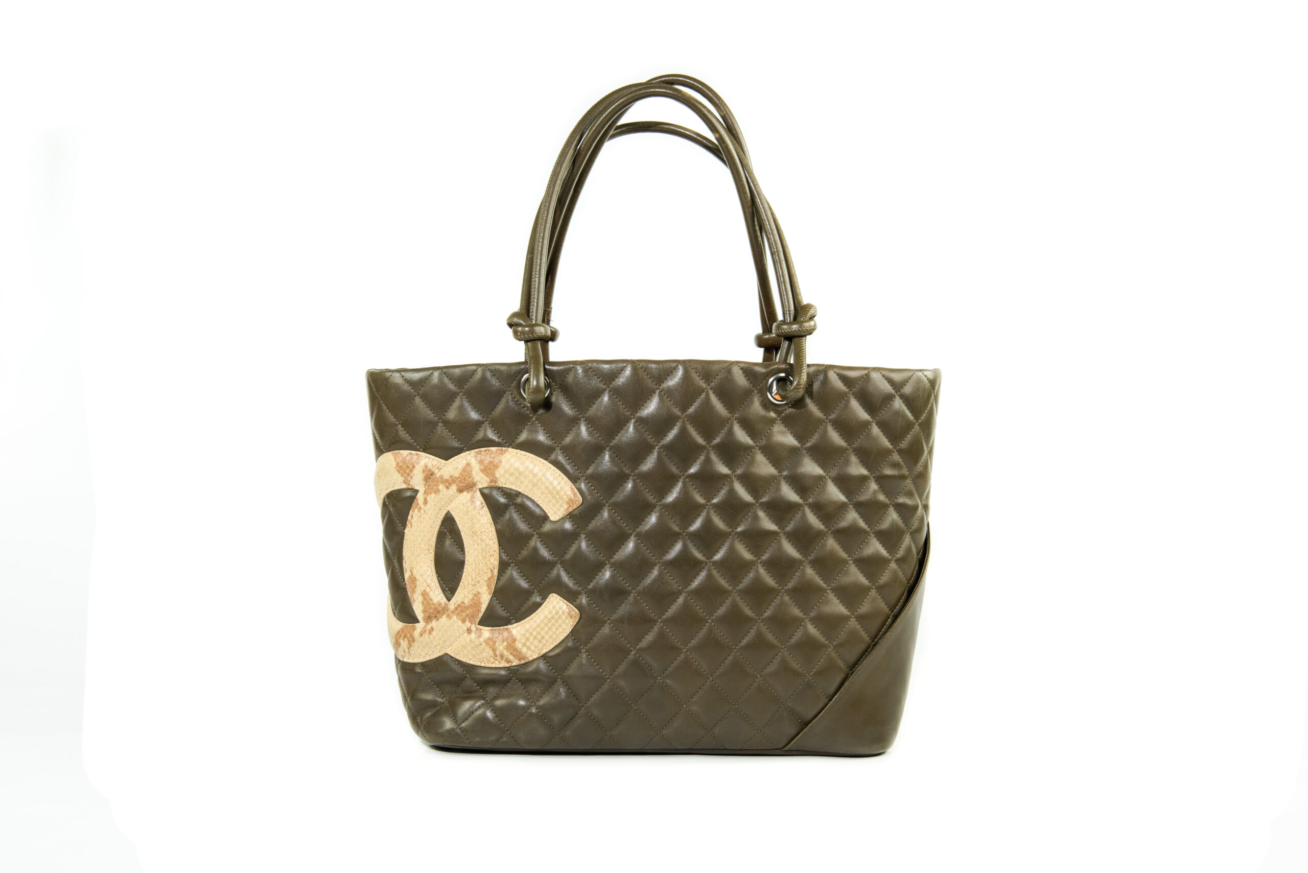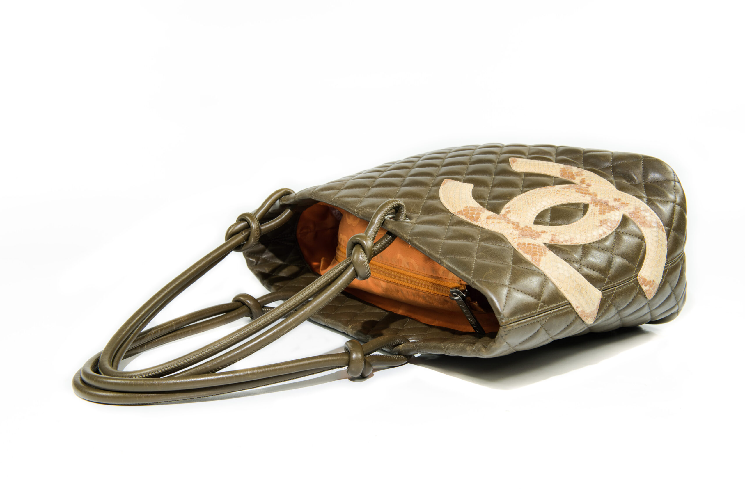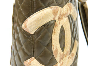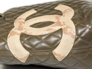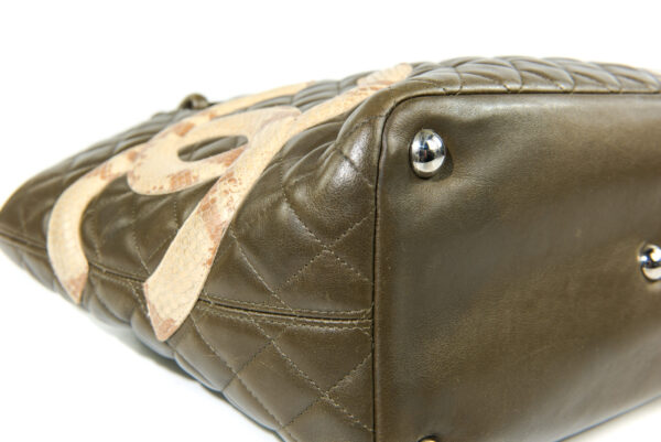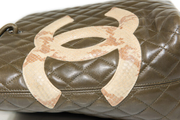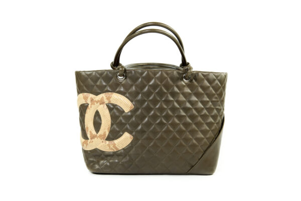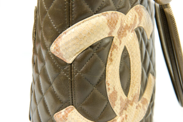 Generellt: En utsökt CHANEL Cambon Tote Python i mycket vackra gröna färgen med inslag av brunt. En riktigt fin väska med inredning i orange. Väldigt effektfullt. CC i Python. Levereras komplett med dustbag, intakt serial sticker, och äkthetsintyg. Utsökt skick utan något direkt slitage