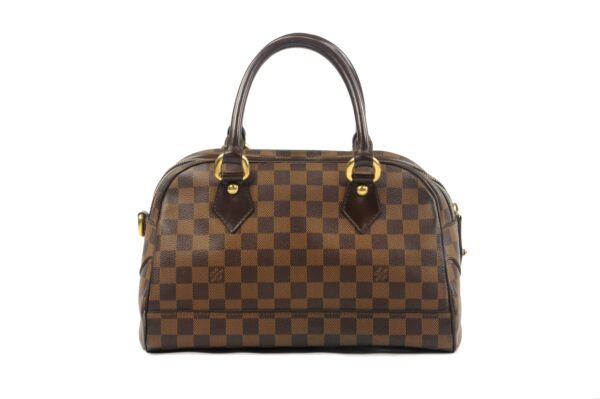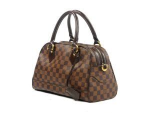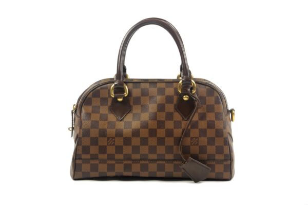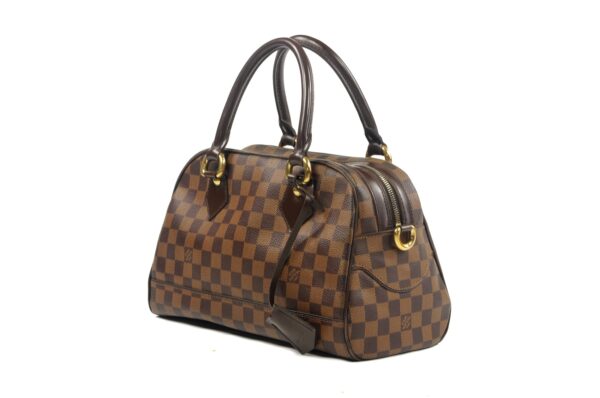 Generellt: En utsökt Louis Vuitton Duomo Damier Ebene. Verkligen en fin handväska som det finns möjlighet att koppla på en axelrem och använda som axelväska eller crossbody. Ganska ovanlig väska. Levereras ink lås, nyckel, clochette och äkthetsintyg.