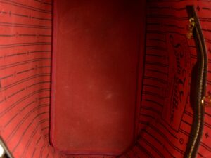 Generellt: En mycket fin Louis Vuitton Neverfull MM Damier Ebene. Ovanligt bra skick för att vara en neverfull.Lite smutsig i botten på inredningen. helt ok straps och fint kantband runt öppningen. Vacker kontrast på den röda inredningen och Damiern.